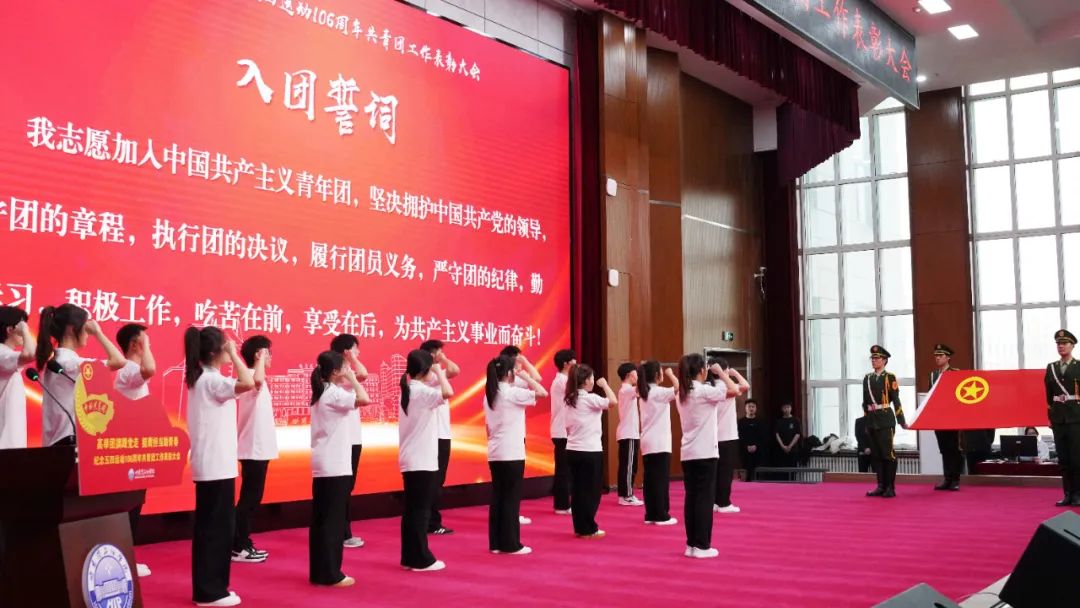 重温入团誓词环节,4名国旗护卫队学生,8个学院17名优秀团员代表上台与全场师生共同重温入团誓词,坚定团员青年们不忘初心、牢记使命的信念与决心。