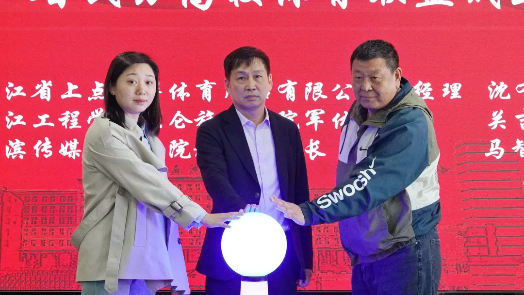 黑龙江省上点舒华体育用品有限公司总经理沈有启、黑龙江工程学院昆仑旅游学院军体部主任关吉臣、哈尔滨传媒职业学院教务处处长马智超代表企业、本科高校、专科高校,共同见证联盟成立。