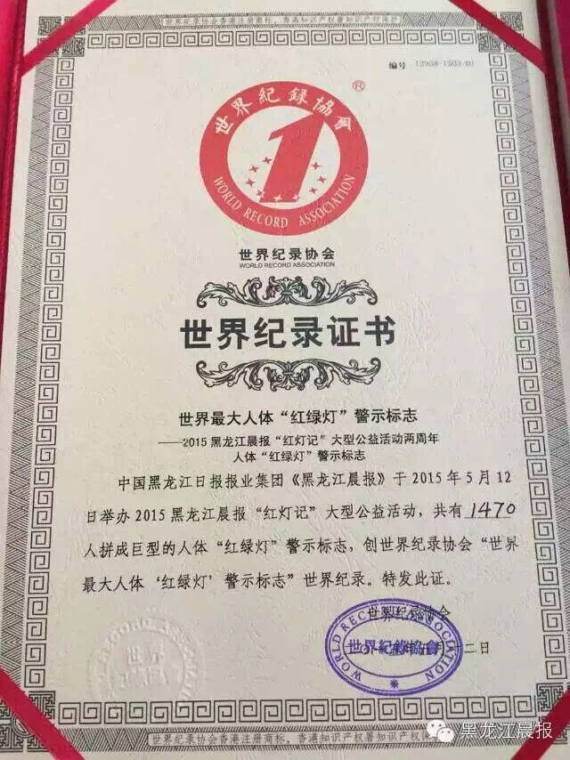 在“红灯记”二周年之际,为倡议文明出行,黑龙江日报报业集团黑龙江晨报发起挑战世界最大人体“红绿灯”世界纪录。2015年5月12日,伟德bv国际体育1470名大学生志愿者参与组成世界最大人体“红绿灯”警示标志,成功挑战世界纪录。