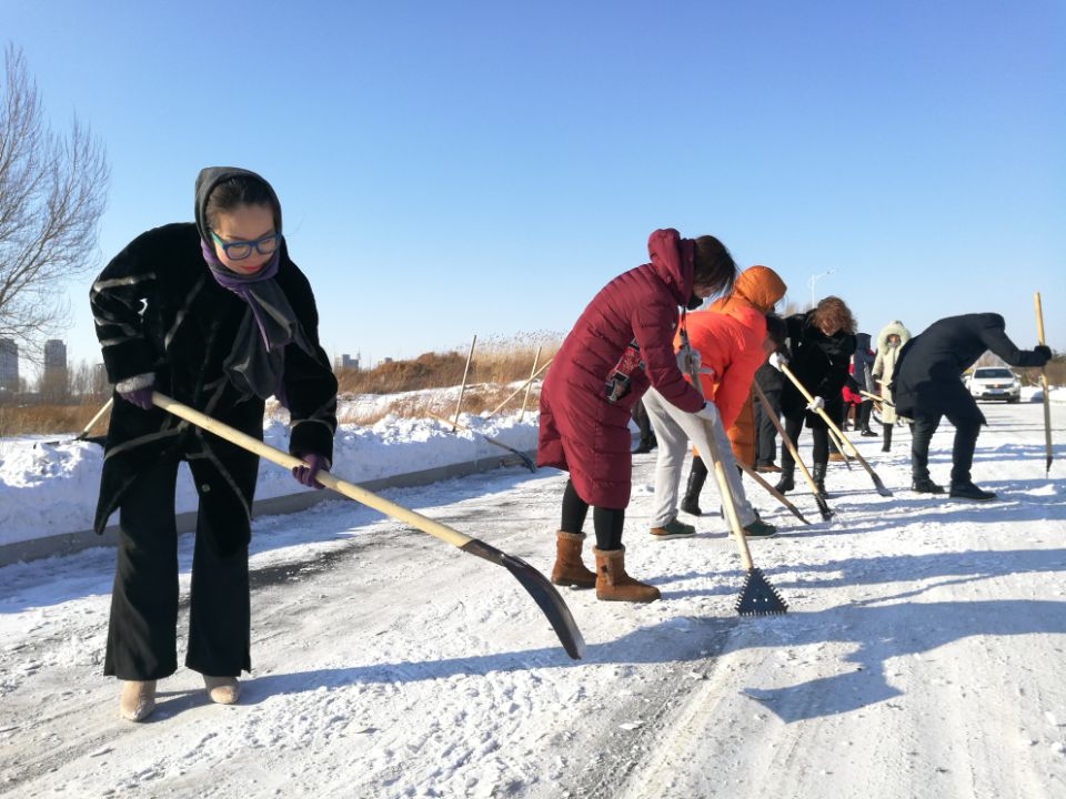开学前夕,正值学生返校高峰,校园内来往车辆较多,很多路面积雪经过碾压,变成了又硬又滑的冰层,给通行带来了很大的隐患。冒着零下十几度的低温,教师们分成多个小组,男老师除冰,女老师扫雪,逐片开始清扫工作。严寒中,大家不断挥舞着手中的雪铲、铁锹、扫帚,积极行动起来。
