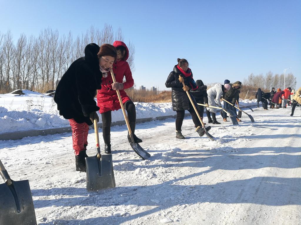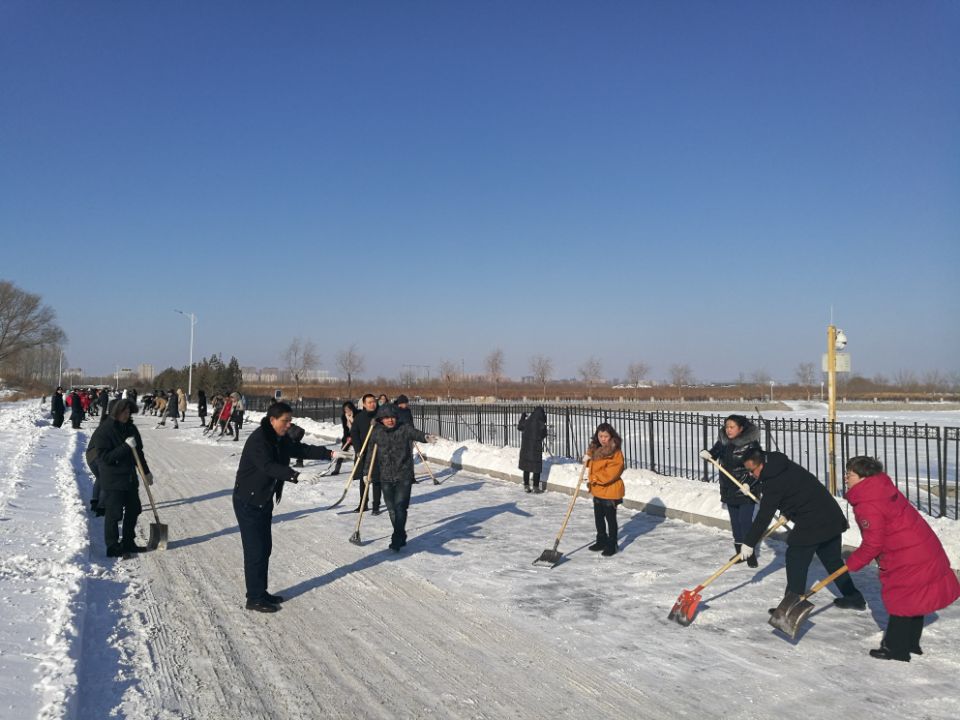 寒冷丝毫没有影响大家劳动的干劲,老师们有序分工,前面的把冰层敲碎,后排的立即用雪铲推走,几轮下来,地面的冰层就被清除干净。许多过路的车辆司机看到老师们奋力清扫的劳动场景,都自觉放慢车速,有的还透过车窗向他们挥手致意。经过两个多小时的清扫,校园内的主干道路冰雪被清扫干净,清扫工作顺利结束,确保了校园内通行的安全畅通。