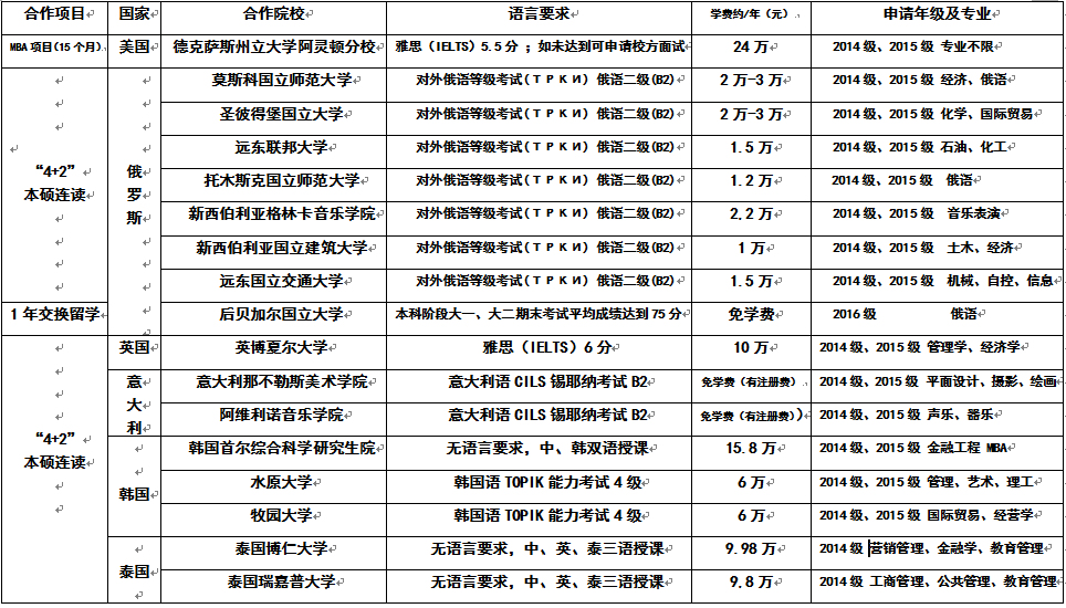 根据我院与美国德克萨斯州立大学阿灵顿分校、俄罗斯莫斯科国立师范大学、圣彼得堡国立大学、远东联邦大学、远东国立交通大学、新西伯利亚国立建筑大学、新西伯利亚格林卡音乐学院、托木斯克国立师范大学、后贝加尔国立大学、英博夏尔大学、意大利那不勒斯美术学院、阿维利诺音乐学院、韩国首尔综合科学研究生院、水原大学、牧园大学、泰国博仁大学、泰国瑞嘉普大学等院校的合作协议,为有意向出国学习的学生提供平台,现将出国留学项目报名事宜通知如下: