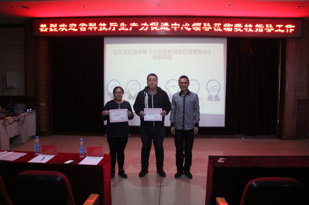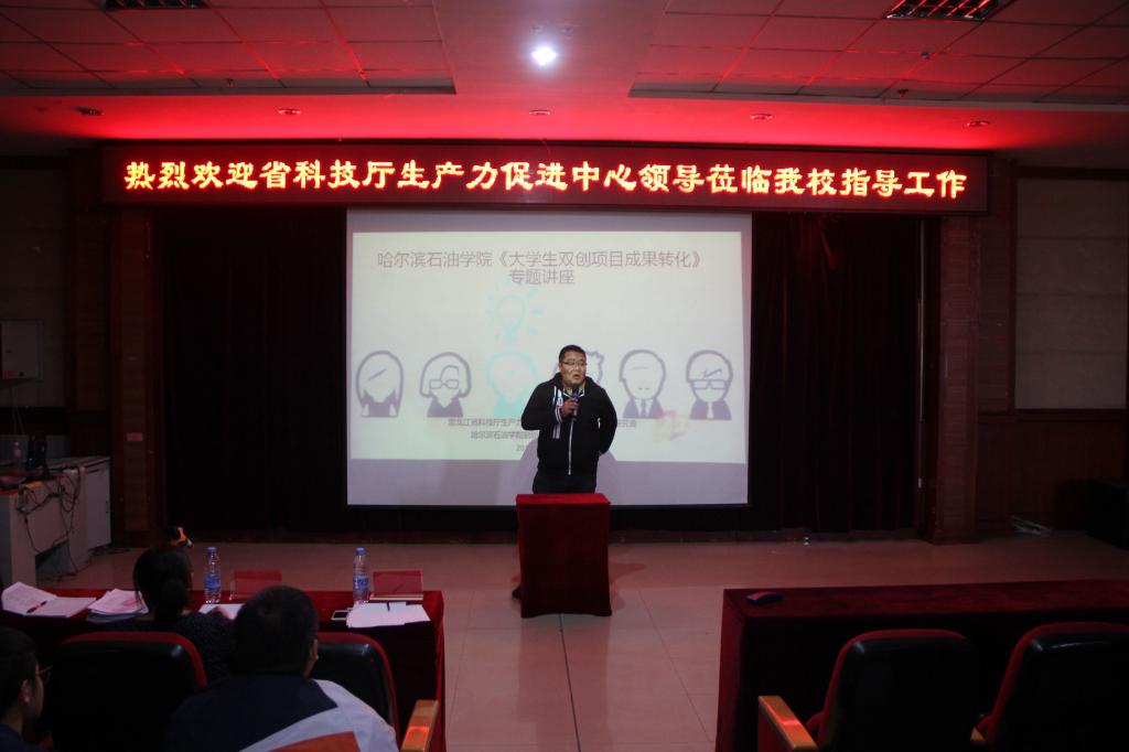 为深入贯彻落实习近平新时代中国特色社会主义思想、党的十九大精神和《国务院办公厅关于深化高等学校创新创业教育改革的实施意见》精神,丰富创新创业实践教育体系,学习双创项目成果转化的方法,让大学校园的创新活力得到进一步激发。伟德bv国际体育创新创业中心于2018年4月25日,在主教学楼518会议室,邀请到黑龙江省科技厅生产力促进中心的崔文韬、李南南老师,为伟德官网带来了《大学生双创项目成果转化》专题讲座,校创新创业中心主任张耘、科研处处长王妍玮出席本次活动。