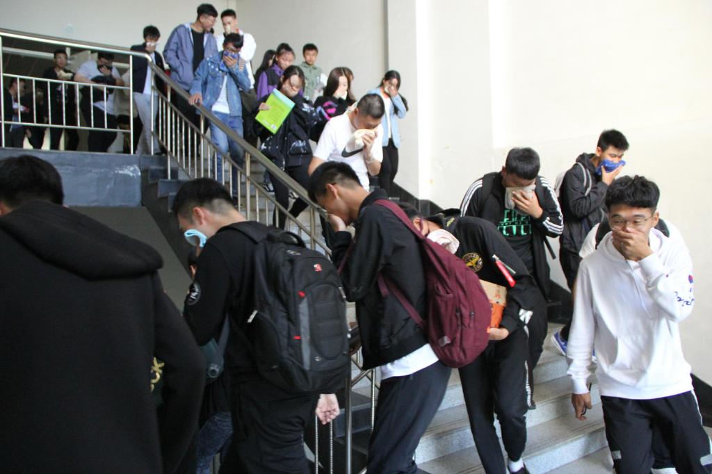 会上,康平军首先强调了校园防火的重要性,他从各高校发生的火灾案例讲起,要求全体同学要高度重视,警钟长鸣,关注生活中的安全隐患,在遇到突发事件时应及时向学院领导或辅导员老师汇报,确保安全信息畅通。随后,保卫处王岗老师则向同学们具体介绍了在面对火灾时如何逃生疏散的具体知识和注意事项。并对稍后的疏散演习提出了具体明确的要求。与会同学在听到演练指令后,立即从座位上站起,快速有序的跑向室外, 在康平军书记的引导下,根据预定路线,弯着腰,用事先准备好的毛巾捂住口鼻,有序撤离现场,到达阳光大厅后广场的指定位置。演练结束后,保卫处王岗老师对同学们的表现,给予了充分的肯定。并现场指导大家如何使用灭火器灭火,重点强调了在面对火灾时,一些值得注意的问题。