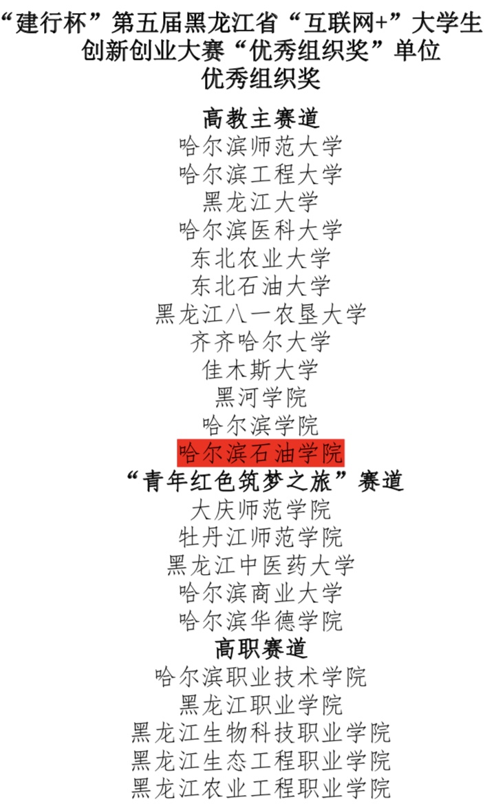 为深入贯彻落实全国和我省教育大会精神,全面落实习近平总书记给中国“互联网+”大学生创新创业大赛“青年红色筑梦之旅”大学生的重要回信精神,按照《国务院办公厅关于深化高等学校创新创业教育改革的实施意见》(国办发〔2015〕36号)、《黑龙江省人民政府关于促进大学生创新创业的若干意见》(黑政发〔2015〕16号)和《教育部关于举办第五届中国“互联网+”大学生创新创业大赛的通知》(教高函〔2019〕8 号)要求,加快培养创新创业人才,持续激发大学生创新创业热情,展示创新创业教育成果,搭建大学生创新创业项目与社会资源对接平台,省教育厅于2019年4月至9月举办“建行杯”第五届黑龙江省“互联网+”大学生创新创业大赛(以下简称“大赛”)暨第五届中国“互联网+”大学生创新创业大赛选拔赛。
