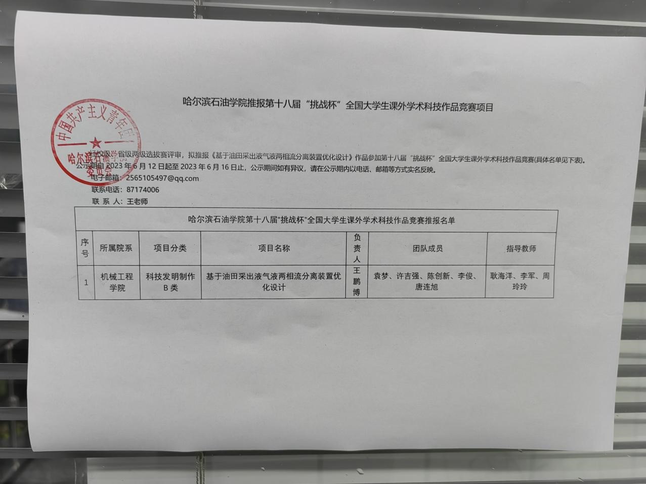 经校级、省级两级选拔赛评审,拟推报《基于油田采出液气液两相流分离装置优化设计》作品参加第十八届“挑战杯”全国大学生课外学术科技作品竞赛(具体名单见下表)。