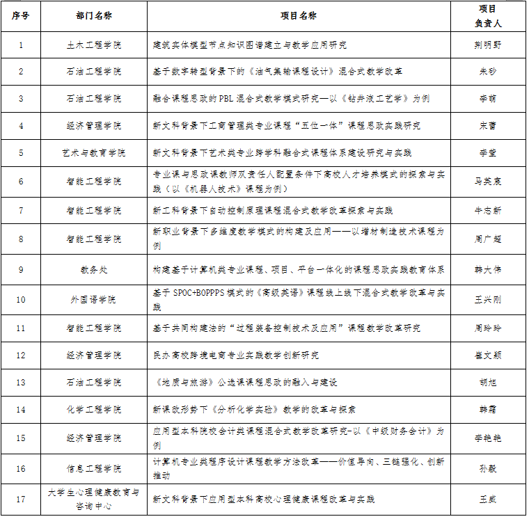 根据学校《关于开展2023年度教育教学改革研究项目申报、结题的通知》工作安排,学校组织开展了2023年度教育教学改革研究项目申报及评审工作,经个人申报,学院(部)推荐,共申报教育教学改革研究项目29项,经学校专家组评审,拟立项校级项目17项。现将结果予以公示。