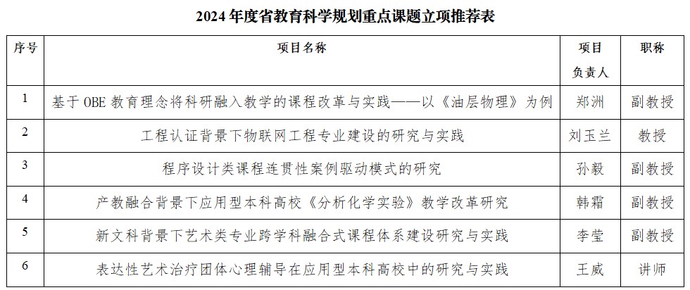 根据黑龙江省教育科学规划领导小组办公室《关于组织开展高等教育2024年度省教育科学规划重点课题立项申报工作的通知》工作安排,学校组织开展了相关工作,此次立项项目从2022、2023年度校级教改项目中遴选产生。经个人申报,教学部门推荐,学校专家组评审,最终从14项申报项目中推荐以下6项参与省教育科学规划重点项目的评审,现将结果予以公示。