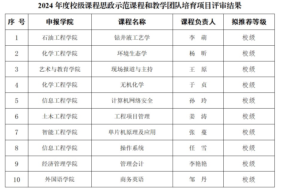 根据教学工作安排,学校组织开展了2024年度校级课程思政示范课程和教学团队培育项目(以下简称“课程思政示范项目”)立项评审工作。经个人申报、各院(部)推荐、学校专家组评审,评选出以下10项为2024年校级课程思政示范项目。现将结果予以公示。
