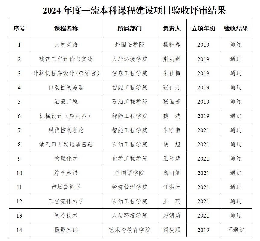 根据教学工作安排,学校组织开展了2024年度一流本科课程建设项目验收评审工作。经学校专家组评审,以下13项一流本科课程建设项目通过验收。现将结果予以公示。