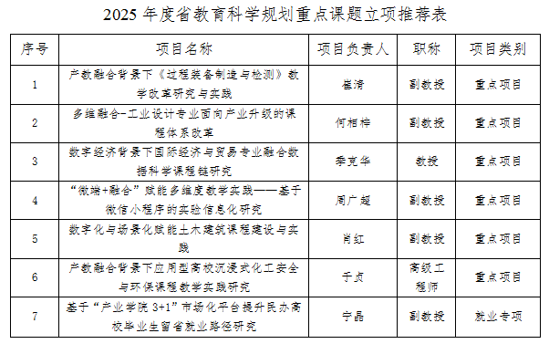 根据黑龙江省教育科学规划领导小组办公室《黑龙江省教育科学规划领导小组办公室关于组织开展高等教育2025年度省教育科学规划重点课题立项申报工作的通知》及《黑龙江省教育科学规划领导小组办公室关于开展2025年度黑龙江省高校毕业生就业专项重点课题申报工作的通知》工作安排,学校组织开展了相关工作。经个人申报,教学部门推荐,学校专家组评审,拟推荐以下7项参与省教育科学规划重点项目的评审,现将结果予以公示。