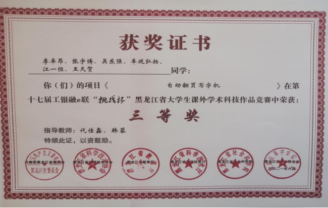 在校期间,在思想上他积极向党组织靠拢,大一刚入学就向党组织递交了入党申请书,努力学习党的理论知识,积极参加主题党日活动,不断提高党性修养,于2021年12月光荣成为了一名中共党员;在学习上,他勤奋刻苦,成绩优异。早早树立了明确的学习目标,三年中,他的各门功课都取得了优异的成绩,分别获得2020年国家励志奖学金、校三等奖学金、校三好学生标兵等荣誉;在学生干部工作中,他也积极要求进步,尽职尽责,具有较强的工作组织能力,始终坚持德、智、体、美、劳全面发展。在2021年获得第十七届工银融e联“挑战杯”黑龙江省大学生课外学术科技作品竞赛中荣获三等奖。