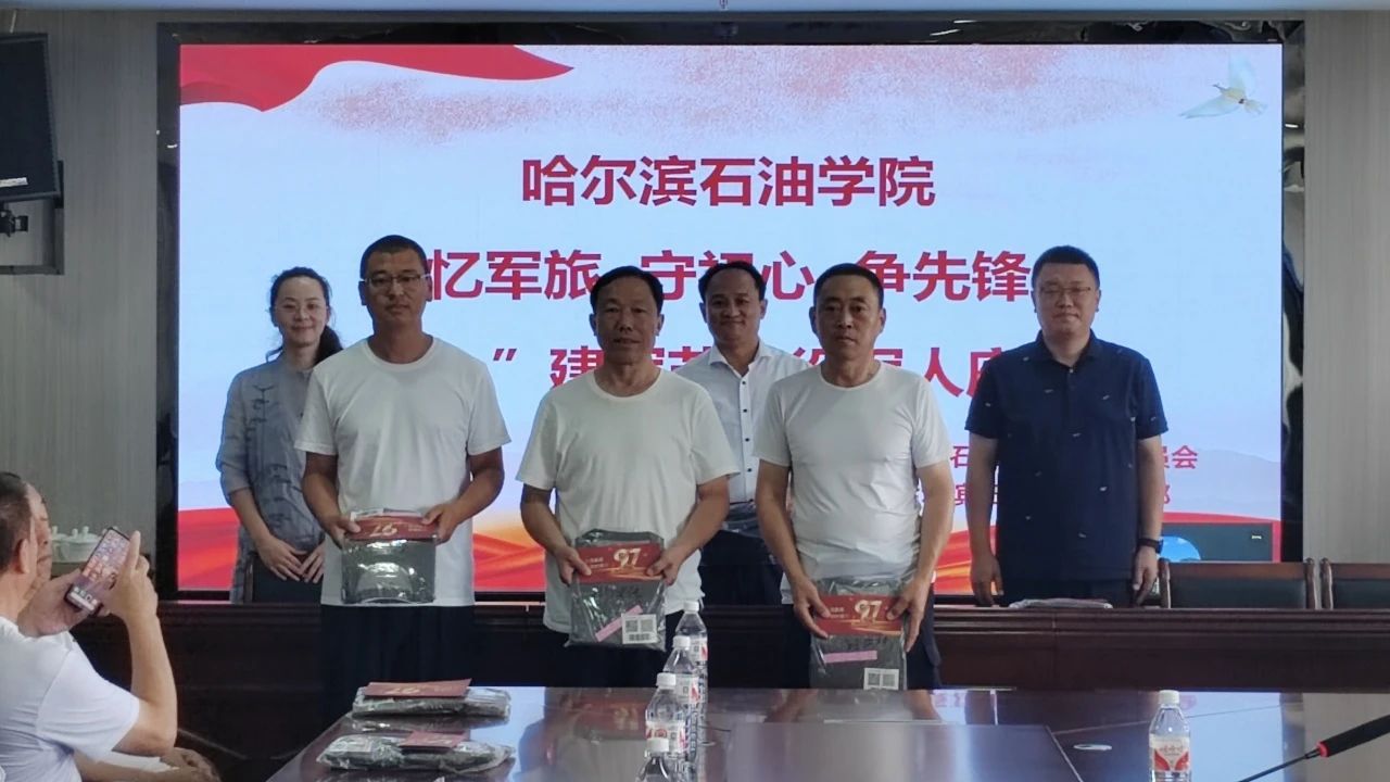 校领导为会议现场的退役教工代表致《致退伍同志的一封信》和节日纪念品。