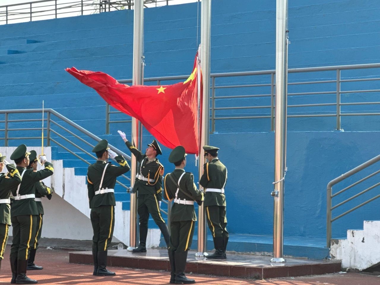 在雄壮的国歌声中,升旗手振臂一挥,五星红旗迎风展开,徐徐升起。全体师生面向国旗,行注目礼,高唱国歌。激昂的歌声在校园上空回荡,表达着对伟大祖国的热爱和对党的崇高敬意。