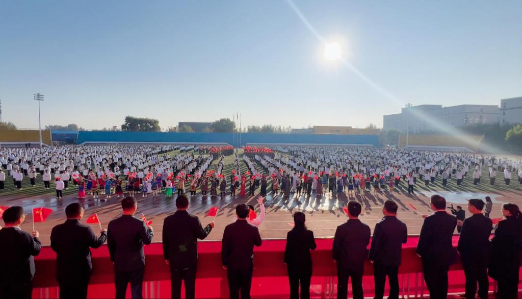 全体师生共唱《歌唱祖国》,用创意的拼字祝福与嘹亮的歌声展示了他们无畏的勇气与炽热的梦想,表达了对祖国的深深热爱与祝福。