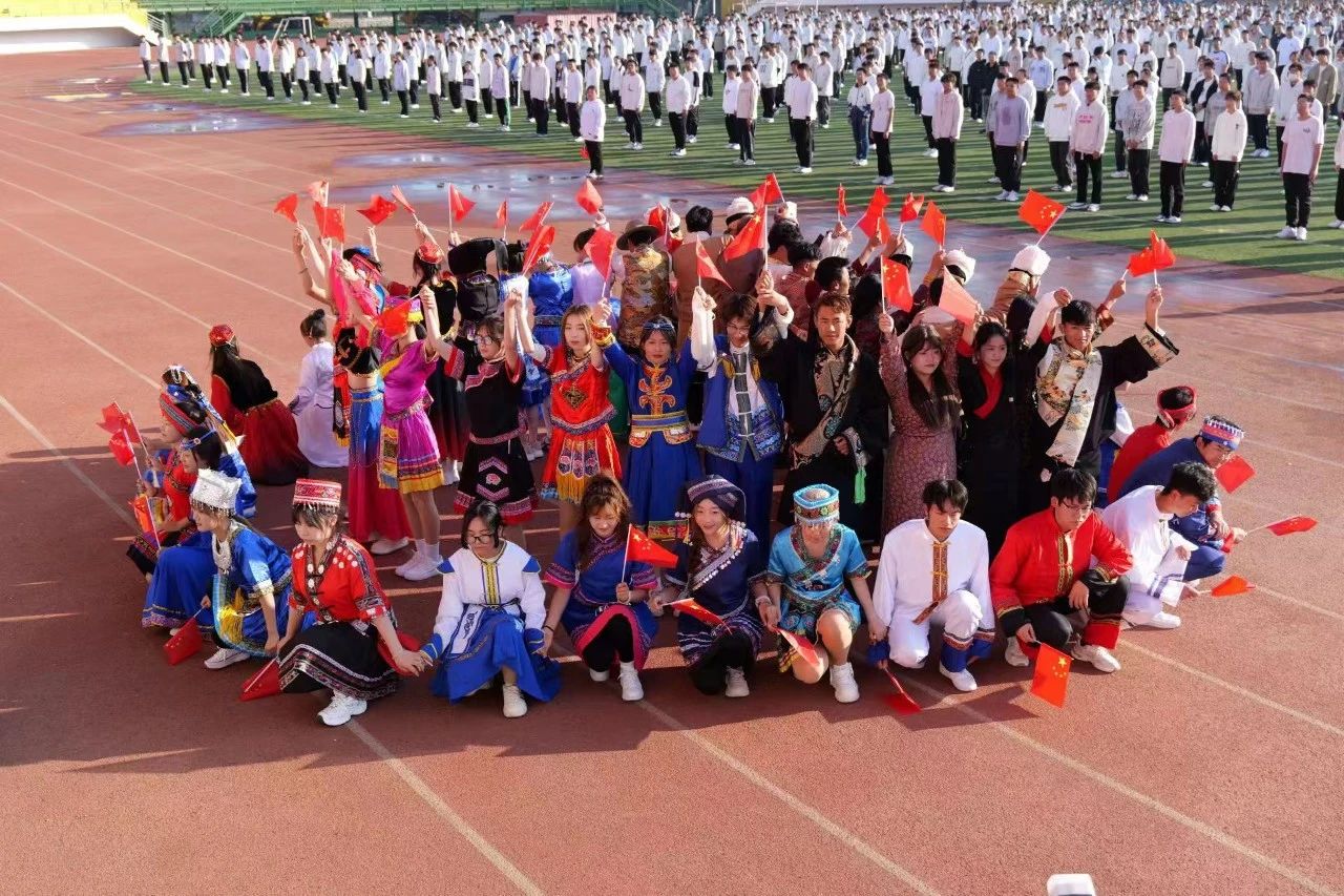 现场身着56个民族服饰的同学于场地中央在《歌唱祖国》激荡的歌声中载歌载舞,表达对祖国美好未来的殷殷期盼,共同祝愿祖国国泰民安、繁荣富强。
