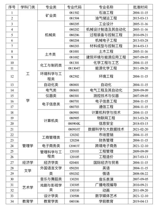 学校现有34个本科专业,涵盖工学、经济学、管理学、文学、艺术学、教育学6大学科门类。