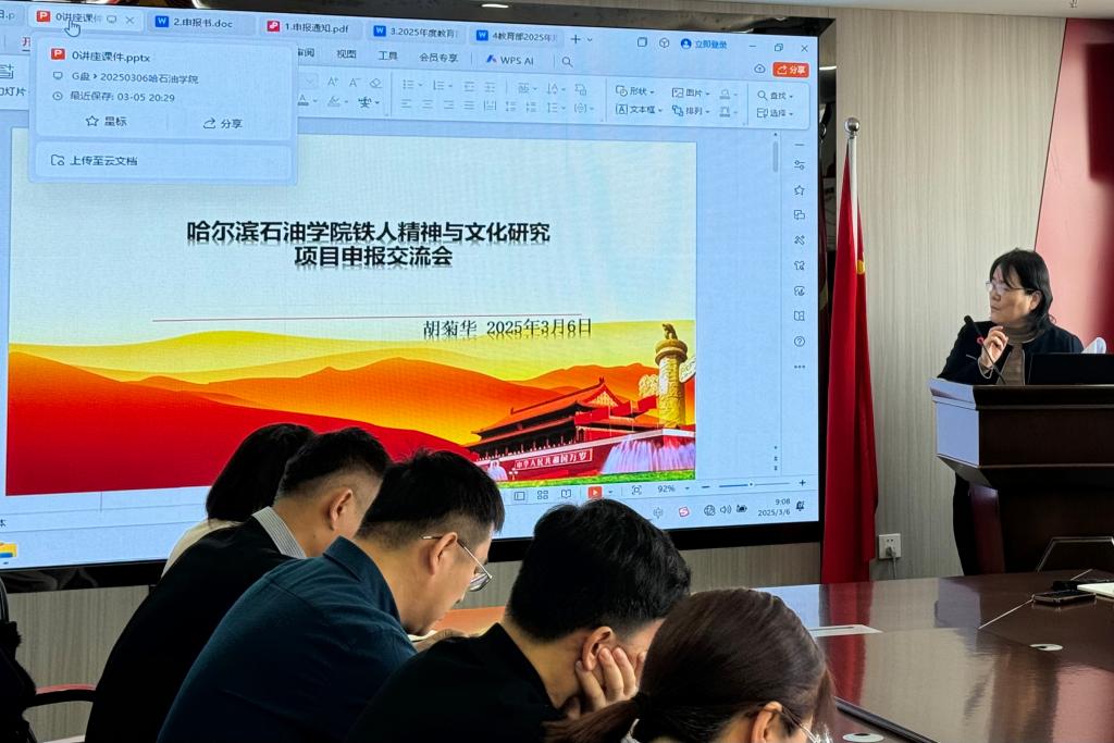 为进一步推进铁人精神与文化的研究工作,扎实推进铁人精神与文化科研项目申报,切实提高申报质量,2025年3月6日,伟德官网召开铁人精神与文化研究项目申报交流会,邀请胡菊华教授作专题辅导。校长王义宁、副校长康平军参加会议。党委副书记、纪委书记、铁人精神与文化研究中心主任刘铎主持会议。中心全体研究人员和马克思主义学院教师参会学习。