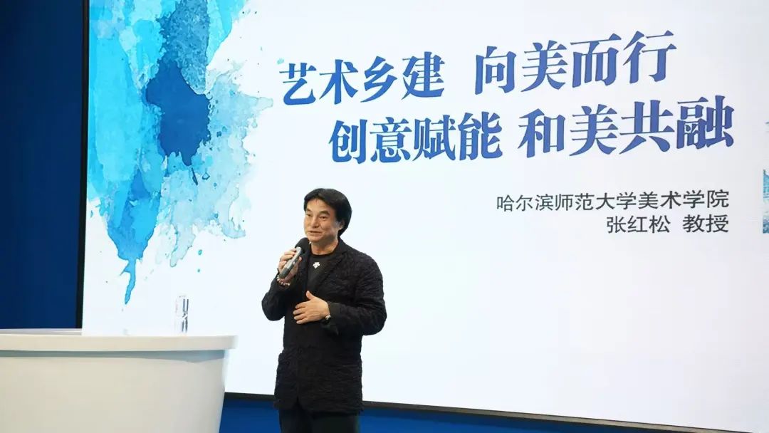 张松教授以“艺术乡建”为核心,结合自身的学术积淀与实践经验,从乡村美学的重构、创意设计赋能产业升级、艺术教育与乡村振兴融合等维度展开论述。他通过“中华粮仓”国庆70周年黑龙江彩车设计、乡村公共空间改造案例等国家级项目,阐释了艺术在活化乡土文化、提升城乡品质中的独特价值,强调“以美为媒,让艺术成为连接城乡共融的纽带”。现场,张教授还分享了其赴世界各地的学术交流成果,为乡村艺术建设提供了国际化视野与本土化路径。