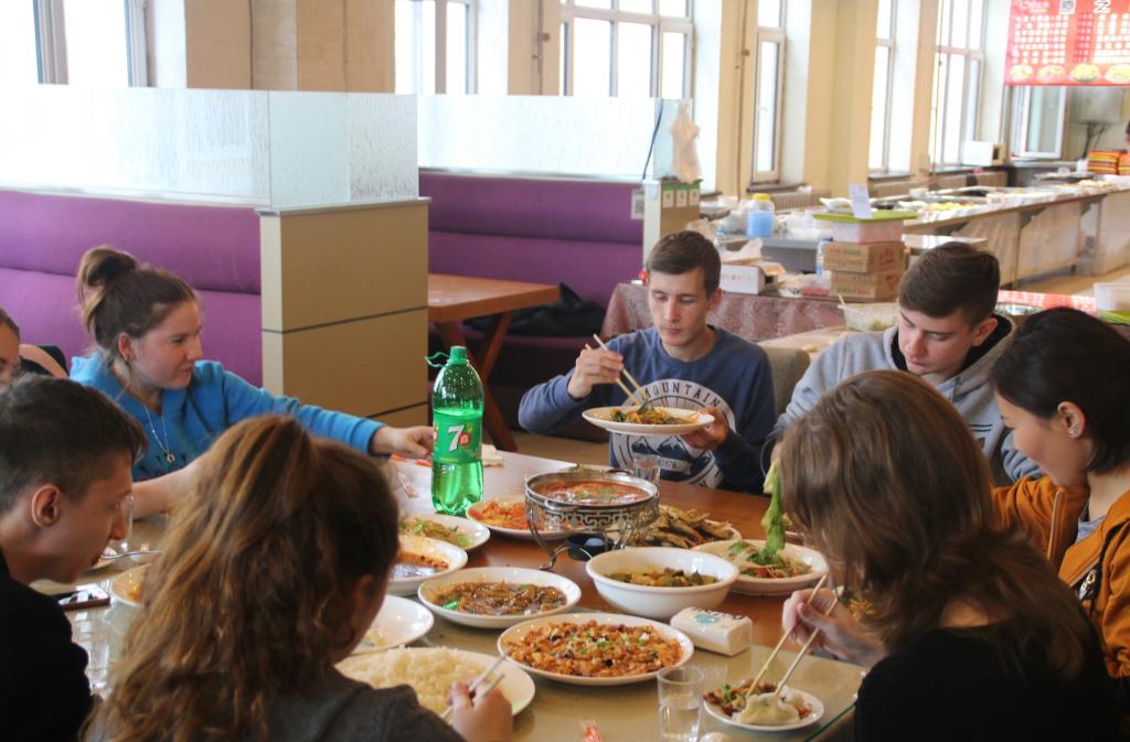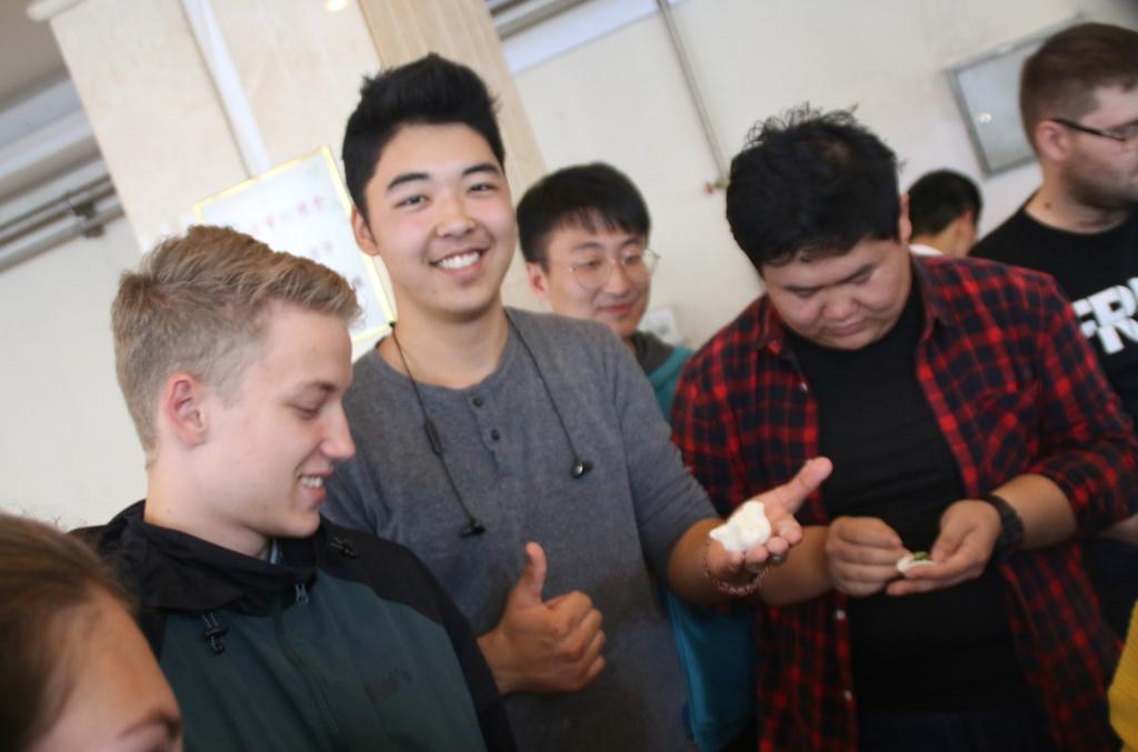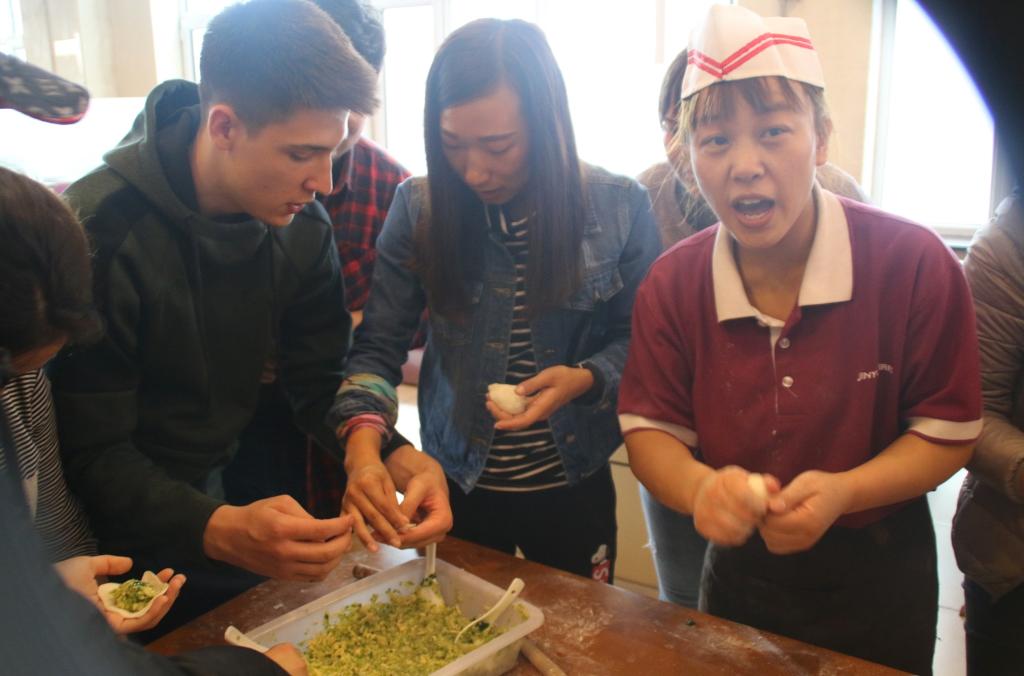 采摘活动结束后,大家把采摘的“战利品”拿到学校食堂,在后勤集团的大力协助下,国际学生与后勤的厨师一起学习包饺子,后勤的厨师早早地准备好了饺子馅儿和面皮,并为留学生们认真讲解了饺子的正确包法。经过一番认真的学习,留学生们便开始有模有样地包了起来,大家忙得不亦乐乎。在大家的努力下,盘中的饺子越来越多,虽然饺子形态各异,却都是大家同心协力的成果。在大家一阵忙碌过后,饺子终于上桌了,后勤集团还为外国留学生准备了丰盛的中秋团圆饭和月饼,大家还表演了具有各自国家特色的节目,联谊活动现场一片欢声笑语,互动交流拉近了彼此距离,加深了友谊。