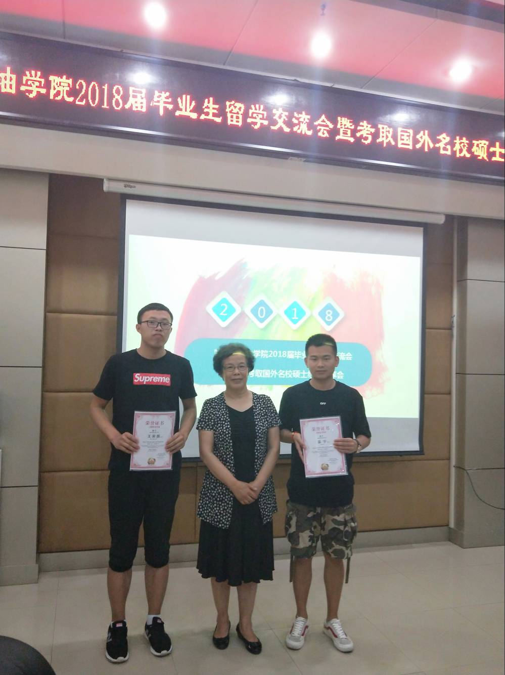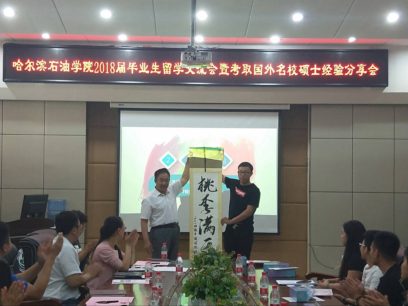 从2018出国留学毕业生代表分享发言中,我们看到这些学生成长了、成熟了,同样也给学弟学妹们树立了良好的榜样。其中,经济管理学院王荣振、姜宇两位同学学习成绩及综合表现突出,荣获“2018届毕业生国际之星”荣誉称号,副书记栾敏教授为2位同学颁发获奖证书及纪念奖品。王荣振同学代表2018届全体出国留学毕业生向母校敬赠《桃李满天下》字画,感恩母校老师们的谆谆教诲和悉心培养以及提供的良好求学环境和浓厚的学习氛围,感恩每位同学在一起一同奋斗和一起成长的青葱岁月,衷心祝愿母校明天更加美好。