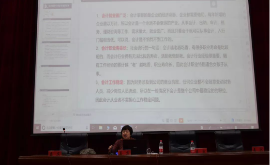 贾老师分别从财务管理的前景、财务管理所需要具备的能力、需要考的相关证件等多方面做出了讲解,她强调首先要树立正确的生涯志向,进行自我剖析和定位,选择适合自己的职业生涯路线,在此基础之上对职业生涯策略进行制定和实施。