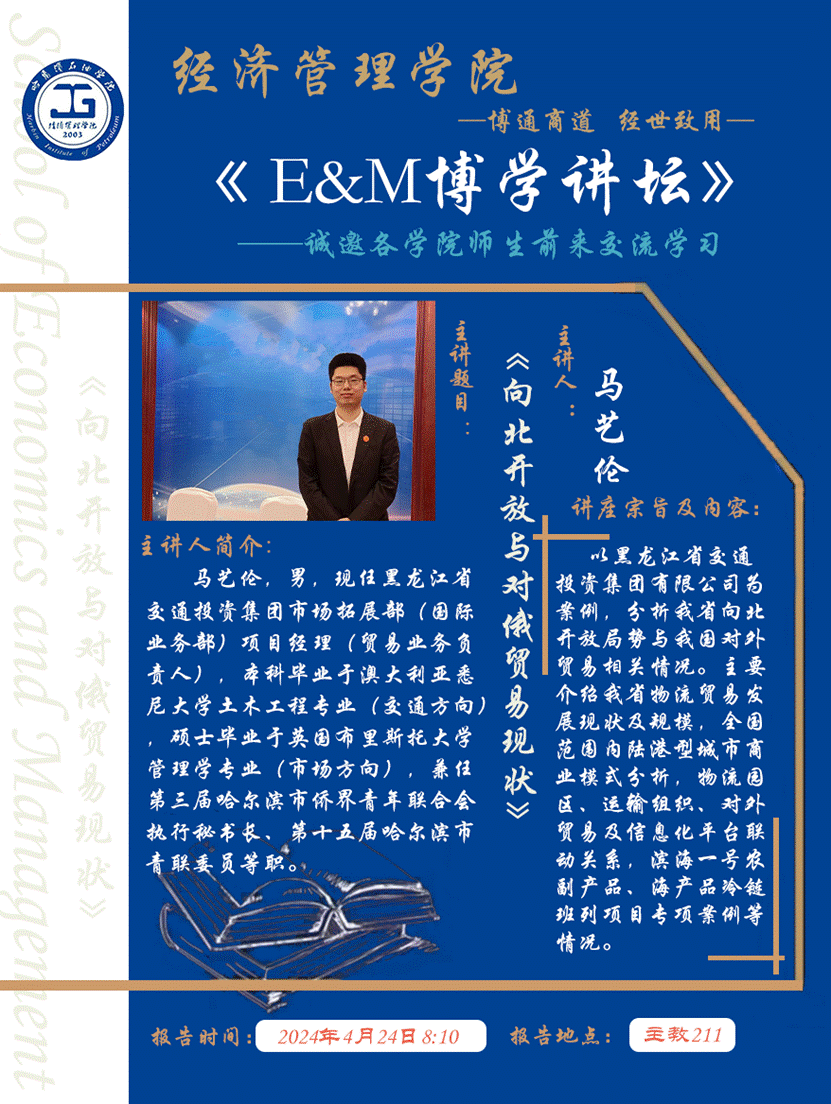 4月24日8:10,经济管理学院将在第一教学楼211教室举办以“向北开放与对俄贸易现状”为主题的专场讲座,本期讲座的主讲嘉宾为马艺伦老师。
