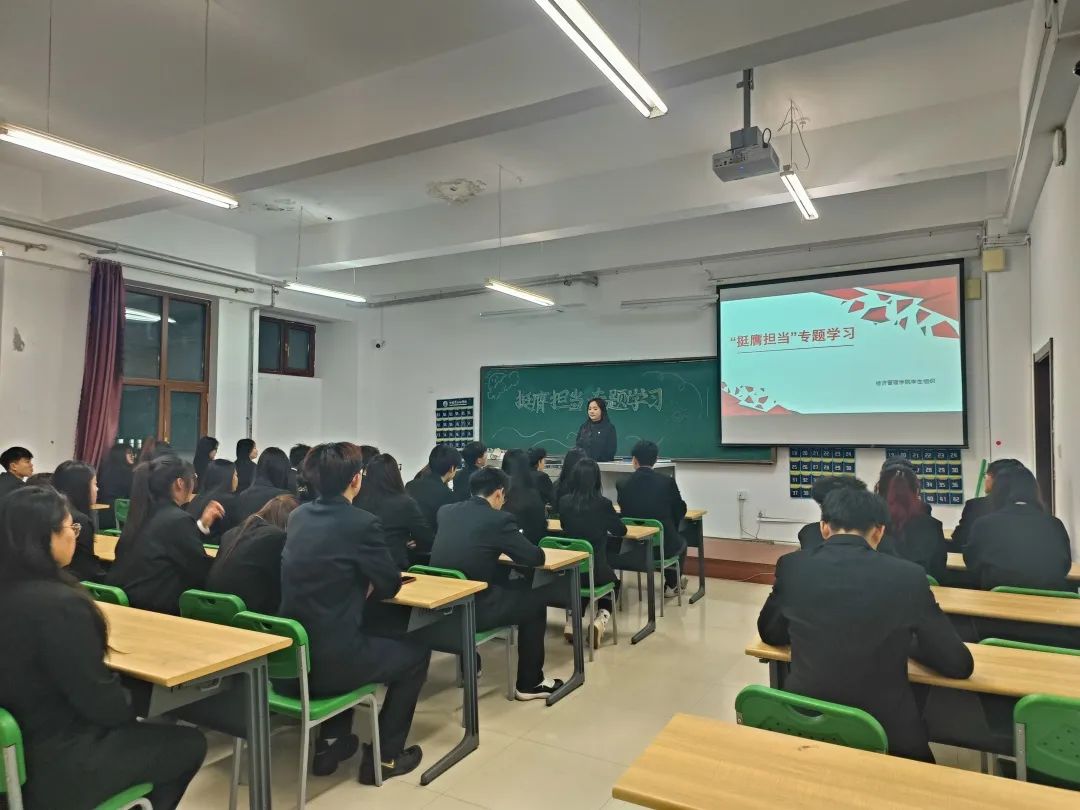 为深入学习贯彻党的二十大精神,加强学生干部思想政治教育,12月17日,经济管理学院学生组织在第二教学楼607教室开展“挺膺担当”专题学习活动。本次活动由经济管理学院团总支副书记马宏艳主持,各部门负责人参加。