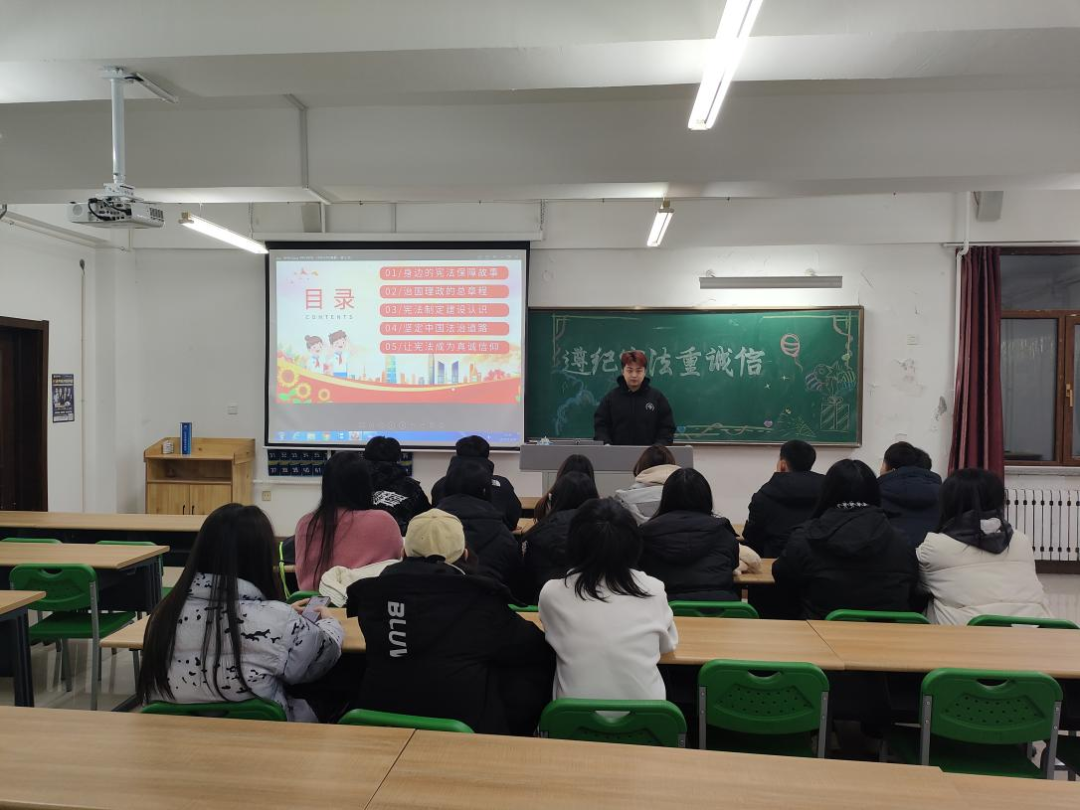 12月1日,经济管理学院学生联合会在第二教学楼201教室举办以“大力弘扬宪法精神,建设社会主义法治文化”为主题的团日活动。本次团日活动是学习宣传贯彻党的二十大精神的重要举措,节目形式多样,为同学们营造了尊崇宪法、学习宪法、遵守宪法、维护宪法和运用宪法的良好氛围,也让同学们将宪法意识内化于心、外化于行,深入学习了宪法和法律,感受了宪法之权威,领略了法律之魅力。