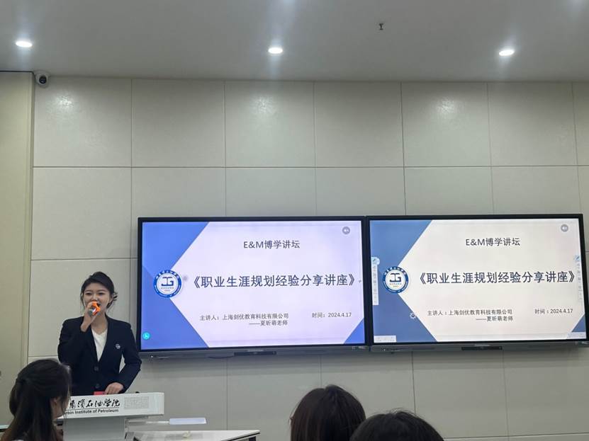 为进一步提升我院学生的职业生涯规划意识,帮助我院学生制定合理的预期目标和阶段规划,不断提升职业素养和专业技能,4月17日,经济管理学院邀请2018级国际经济与贸易专业优秀校友、上海剑优教育科技有限公司总裁助理夏昕萌,回校开展以“职业生涯规划经验分享”为主题的《E&M博学讲坛》第二十四期专题讲座,讲座由张楚柠老师主持。