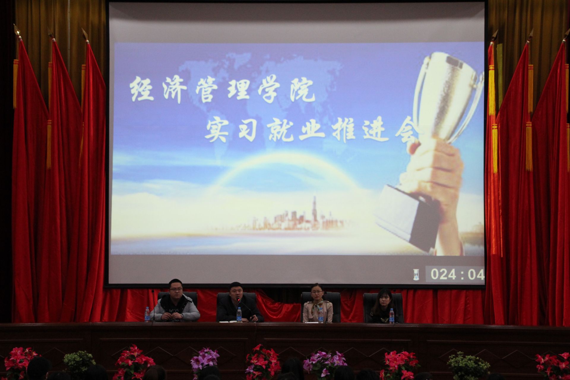 4月17日,经济管理学院在图书馆报告厅召开实习就业推进会,会议由经济管理学院院长冯研主持,党总支书记吴东爽、团总支书记陈志勇、辅导员郭思娇出席会议,2014级全体学生参加了会议。