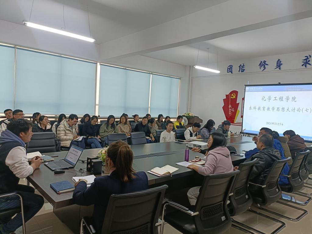根据《化学工程学院开展本科教育教学思想大讨论实施方案》要求,11月5日,学院组织开展本科教育教学思想大讨论第七次集中学习讨论活动,学习活动由副院长彭殿宝主持,院长杨昕、党总支书记赵婧及学院全体教师参加。