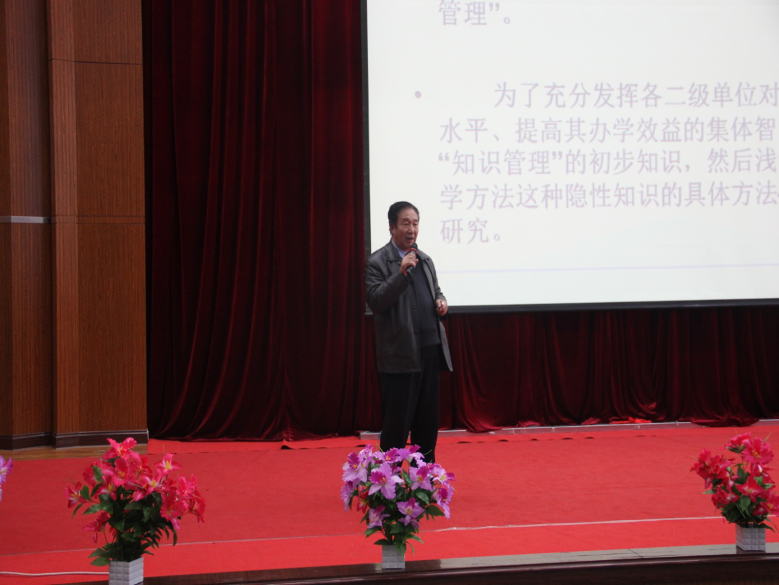 王玉文教授给了在场所有教师一场有高度、有内涵、有新意的讲座,讲座题目为“基于知识管理的视角浅谈教学案例研究”。首先王玉文教授给大家引进了一个全新的概念“知识管理”,提出了什么是知识管理、为什么要进行知识管理,并阐述了进行知识管理的目的。他指出“知识管理的目的并不是不是雪中送炭,而是要锦上添花,是要将良好变成优秀,要将优秀变为卓越”,王玉文教授从教师日常的教学工作出发阐述了如何进行知识管理,知识管理和信息管理的差别,帮助我们的教师如何将知识投入工作中使用。为提高教师的教学研究水平,王玉文教授现场指导教师如何进行案例教学研究,从教学案例选题、教学案例视频记录、教学案例分析、教学案例优化设计四个方面详细的介绍了案例教学研究的方法和步骤。