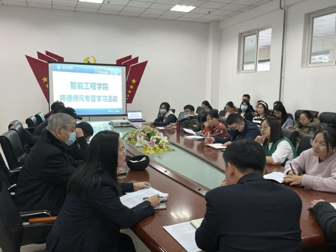 为全面贯彻落实学习习近平总书记关于教育的重要论述和指示批示精神,加强新形势下师德师风建设,推动师德师风建设常态化、长效化,智能工程学院于2023年11月14日下午组织开展了本学期师德师风专题学习活动。本次活动由党总支书记苏永彬主持,全体教工参加。