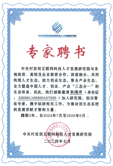 我院教师耿海洋受聘“中关村双创互联网科技人才发展研究院”专家