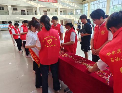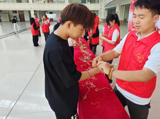 活动伊始,志愿者们着装整洁来到端午节场地,并将场地布置完整,然后将要发放的端午小礼品进行整理和分类,负责人进行分配发小礼品、送祝福等工作。志愿者们手拿五彩绳分布在主教的各个地点进行分发五彩绳,亲手将五彩绳戴在老师和同学的手上并送上祝福。部分同学在志愿者们布置的场地中井然有序的排队领取五彩绳。志愿者们热情的给每一位老师和同学送上端午安康的祝福,通过此次活动,弘扬了中华民族传统文化,增强了学生校园文化的认同感和归属感,增强了大学校园文化建设的内涵。
