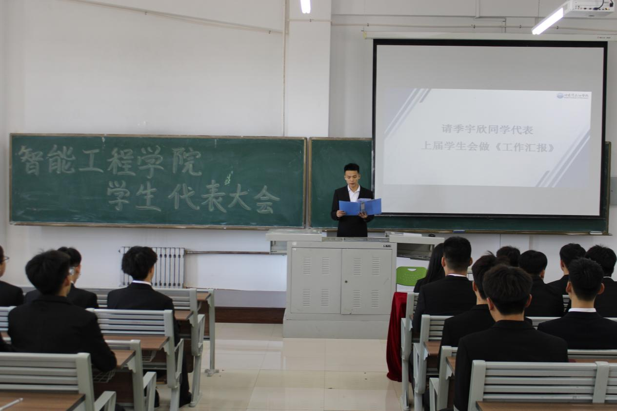 智能工程学院学生会执行主席季宇欣代表上届学生会做工作汇报。他详细介绍了上届学生会的工作内容、成果及存在的问题,并表达了对学生会未来发展的美好期许。季宇欣同学的汇报让与会代表们对上届学生会的工作有了更全面地了解,同时也为新一届学生会的工作指明了方向。