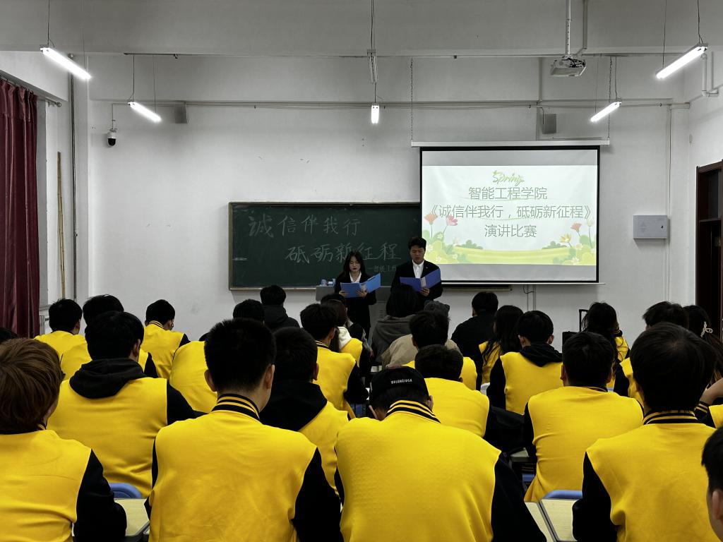 为了倡导诚信的价值观念,引导学生形成积极向上的人生观与价值观,并全面提升其道德素养,同时,为了进一步提高学生的语言表达与逻辑思维能力。智能工程学院于2024年4月19日在主教408成功开展“诚信伴我行,砥砺新征程”主题演讲比赛。