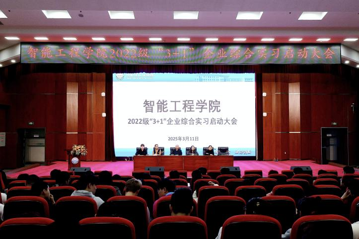 为切实做好2022级学生“3+1”企业综合实习教育指导工作,2025年3月11日,智能工程学院于图书馆报告厅成功召开2022级“3+1”企业综合实习动员大会。智能工程学院院长王俊发、党总支书记吴东爽、副院长陈泮洁、副院长韩蓉、2022级辅导员张丽莉和侯晓锐出席本次大会,全体2022级学生参加本次动员大会,会议由智能工程学院辅导员吕博萱主持。