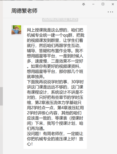 周德繁老师不仅是学生的老师,也是青年教师的老师,为了让青年教师尽快成长起来,经常与青年教师沟通,传授好的教学方法,解决青年教师在备课当中遇到的问题。为青年教师的课堂教学保驾护航。在沟通教学问题时,青年教师被最后一句话深深的感动:没问题,有周老师在,一定让你把机械专业的液压课上好!放心!每一次与周老师的沟通,或是请教教学方法,或是请教具体问题,每次周老师的回答都是详细,耐心并充满鼓励。