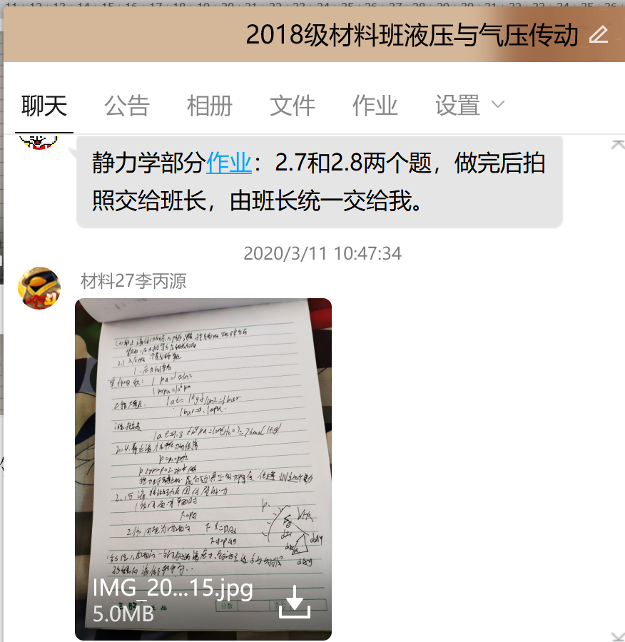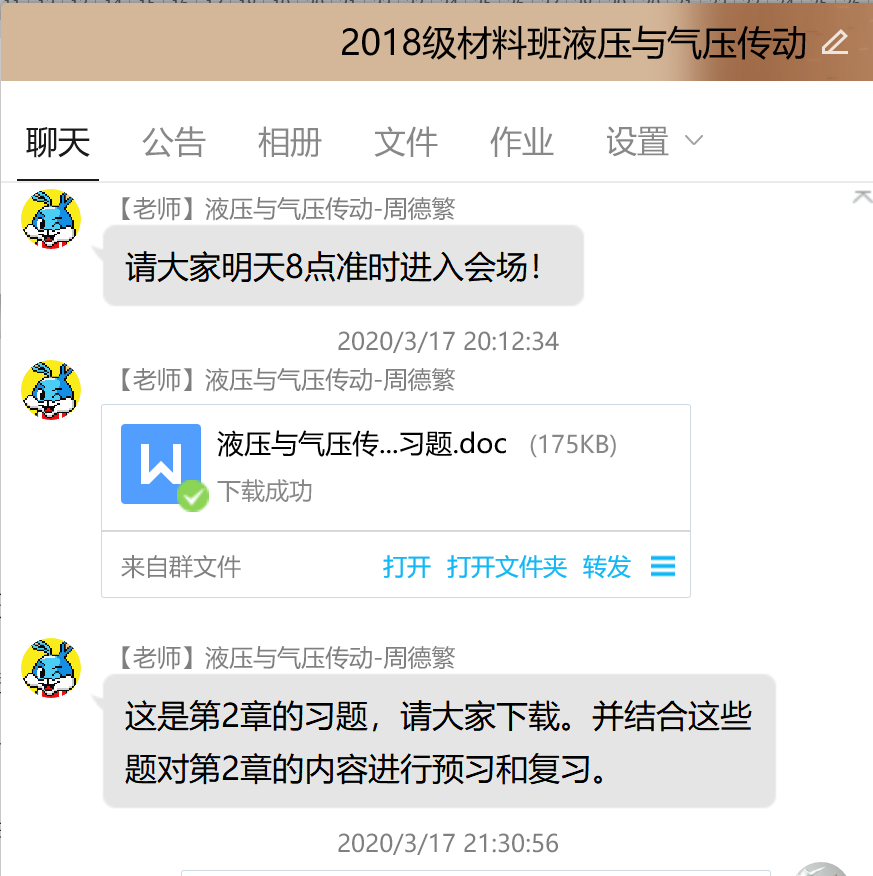 在开课之前,周老师将自己所教的五个班的班长和学委统一加到一个群里,方便开课前的沟通,比如班级学生有多少人,是否有湖北籍的学生,每位同学是否存在网络上课的困难等,班长负责统计,然后汇报给周老师。高兴的是每个同学都期待与周老师在课堂相遇,每位同学都做好了网课的准备。之后,建立液压与气压传动学习QQ群,各班班长负责通知本班学生加入,在QQ群中主要是上传学习资料,答疑,最开始也打算通过QQ的课堂上课,但测试的效果觉得不是很好,周老师又尝试用腾讯会议,觉得效果不错,于是所有的液压与气压传动课程就通过腾讯会议上课了。