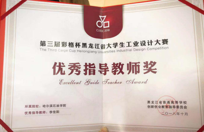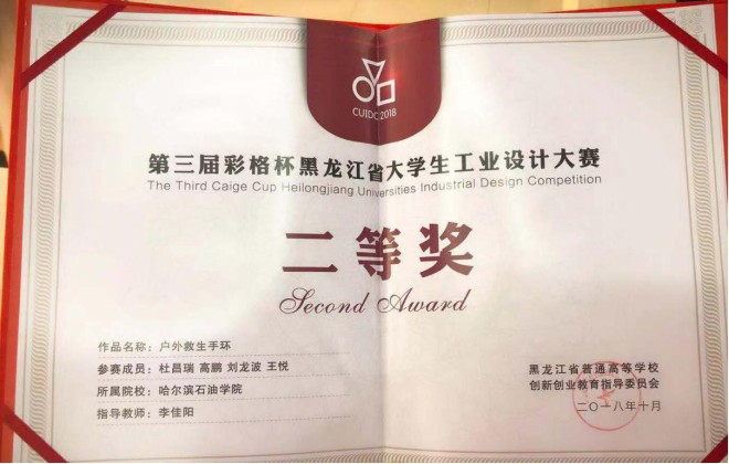 在我院的高度重视下,指导教师李佳阳的精心付出,对培养学生的自学能力、创新能力、自主解决问题的能力发挥了重要作用,也培养了学生脚踏实地、奋发有为的精神面貌和开拓进取、积极向上等优秀品质。经过“彩格杯”黑龙江省大学生工业设计大赛的激烈角逐,我院的参赛作品取得了优异成绩,由李佳阳老师指导的“户外救生手环”喜获黑龙江省二等奖,同时李佳阳老师喜获优秀指导教师奖。