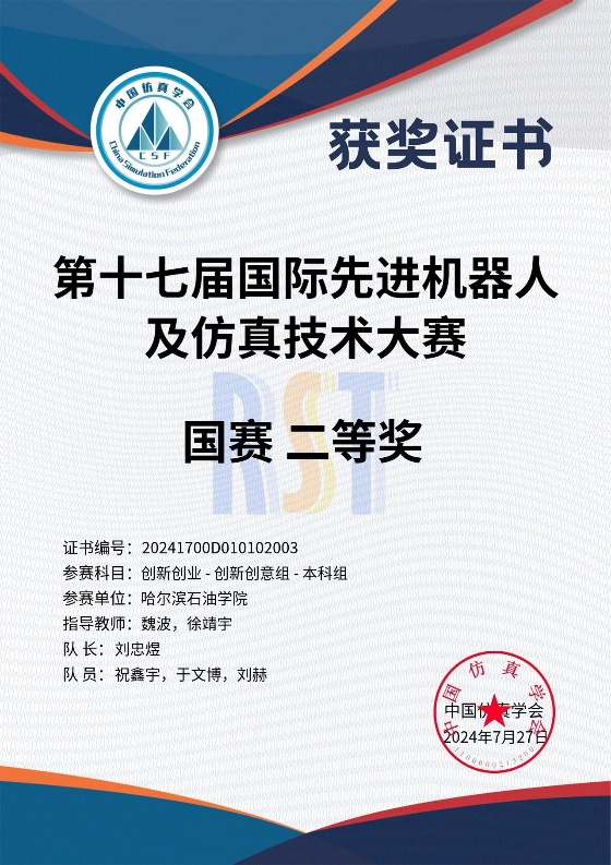 本次大赛由中国仿真学会、南通经济技术开发区、南通职业大学、国际水中机器人联盟共同主办。经过资格赛和省赛的重重选拔,来自清华大学、南开大学、北京航空航天大学等全国各地143所学校共252支队伍成功入围决赛,其中我院指导教师魏波、徐靖宇指导的由队长21级学生刘忠煜同学和队员22级学生祝鑫宇、队员23级学生刘赫、队员23级学生于文博组成的学生团队在本次大赛的创新创意组荣获国赛二等奖。
