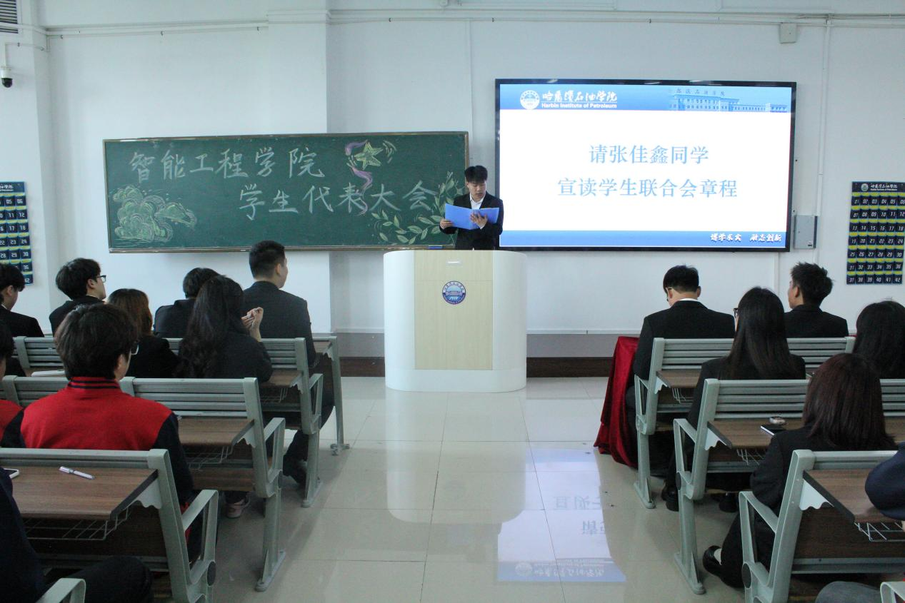 智能工程学院学生代表张佳鑫同学宣读伟德bv国际体育智能工程学院学生联合会章程。