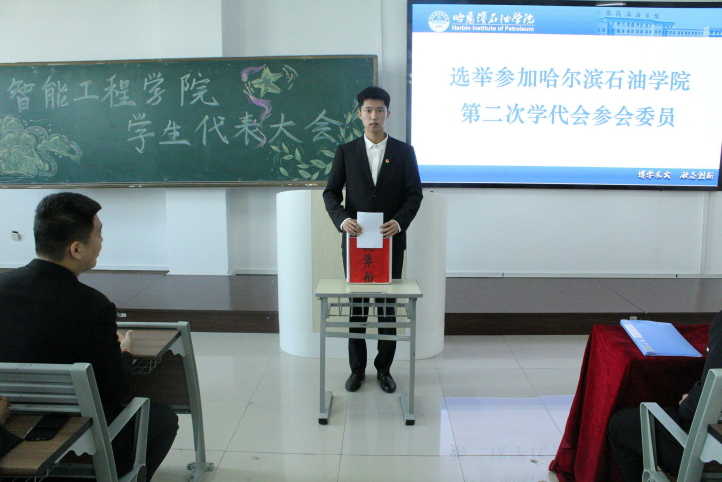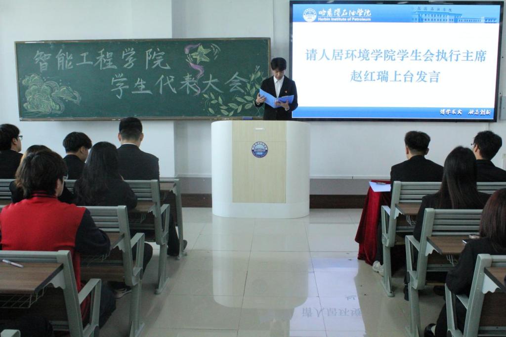 紧接着,人居环境学院学生会执行主席赵红瑞上台发言,他首先对智能工程学院本次学生代表大会的召开表示热烈祝贺,并分享了人居环境学院学生会在组织建设、活动开展等方面的经验和成果,为智能工程学院学生会的工作发展提供了宝贵的经验。