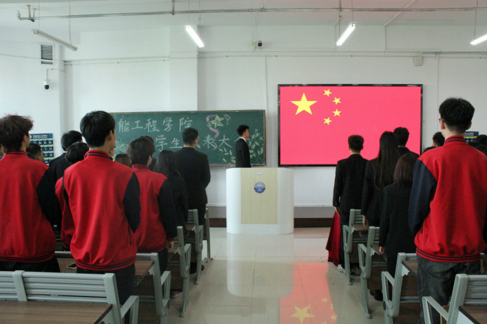 会议伊始,主持人刘旺登台,激昂的中华人民共和国国歌随之响起,全体参会人员起立,共唱国歌,智能工程学院第二次学生代表大会正式拉开帷幕。