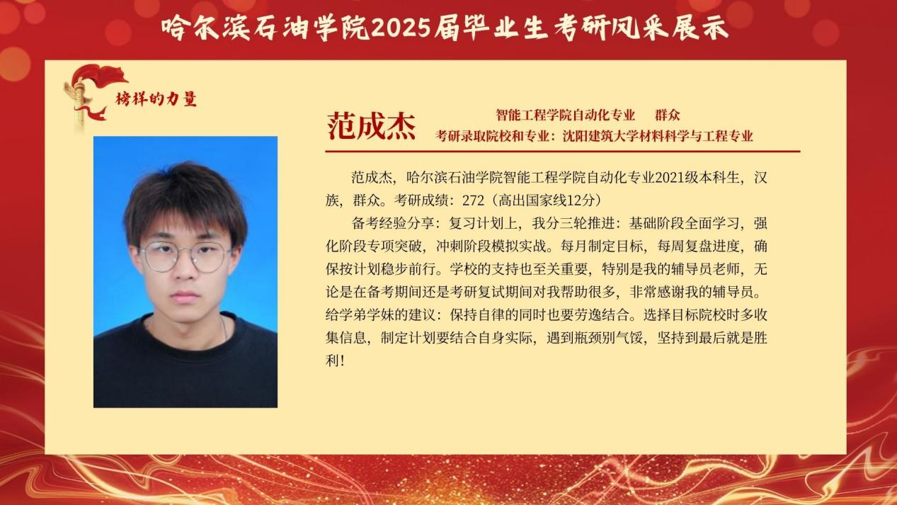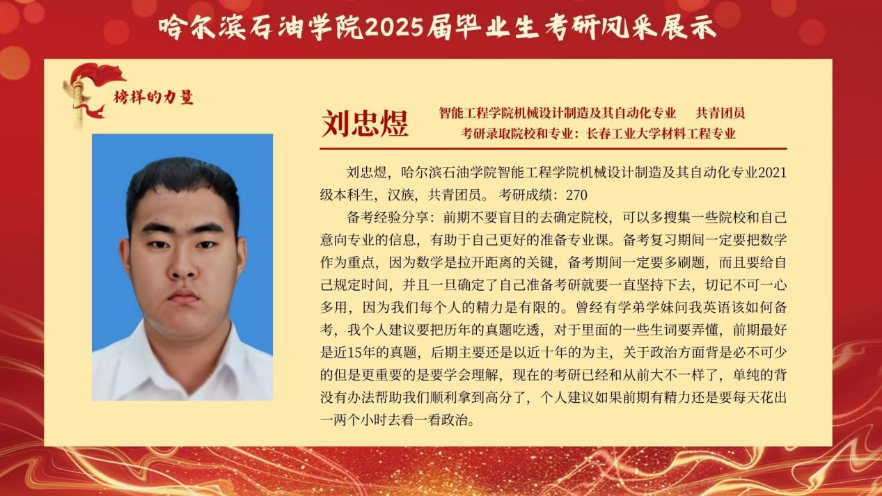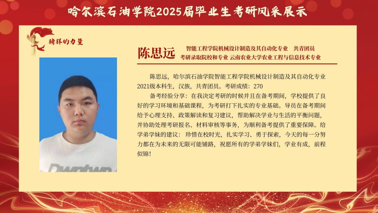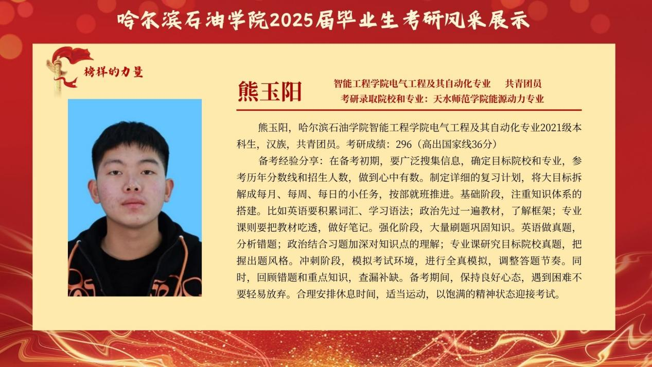 为传递“求知若渴、破壁攻坚”的考研精神,赋能更多学子逐梦“研途”,智能工程学院特别推出 “考研先锋风采展示”专栏。本次展示将全景呈现考研学子的奋斗轨迹:从图书馆的“破晓灯影”到实验室的“科研星火”他们将倾囊分享备考规划、院校抉择、压力疏解 等实战经验,更会揭秘“如何平衡课程与复习”的独家心法,为学弟学妹勾勒清晰的考研进阶图谱。此次风采展不仅是对考研先锋的礼赞,更寄望激励更多智能学子 以理想为帆、以坚持为桨,在学术探索的浪潮中勇立潮头,书写属于自己的“研途”华章!