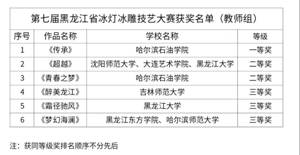 在2024年12月26日结束的获第七届黑龙江省高校冰灯冰雕技艺大赛中,智能工程学院教师李佳阳与艺术与教育学院教师李莹、孟令贤共同完成冰雕作品《青春之梦》获教师组二等奖。