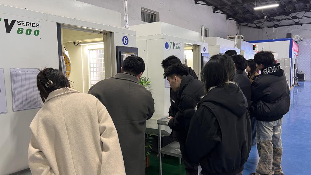 在工作人员的引导下,同学们先是来到了教室做了一个简单的小测试,然后四人一组进行了解数控机器,工作人员详细讲解了产品的生产流程、工艺技术以及质量控制环节,同学们认真聆听,并不时提出心中的疑问,现场互动氛围热烈。