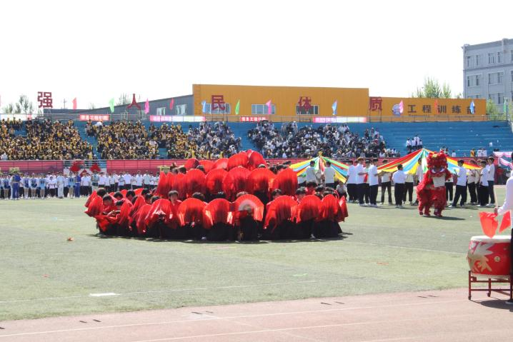 随着鼓点骤响,队员执功夫扇利落舞动,红扇翻飞间尽显刚劲英姿;阵型迅速变幻,巨型磕头机造型拔地而起,精准复刻工业机械韵律,彰显专业特色。